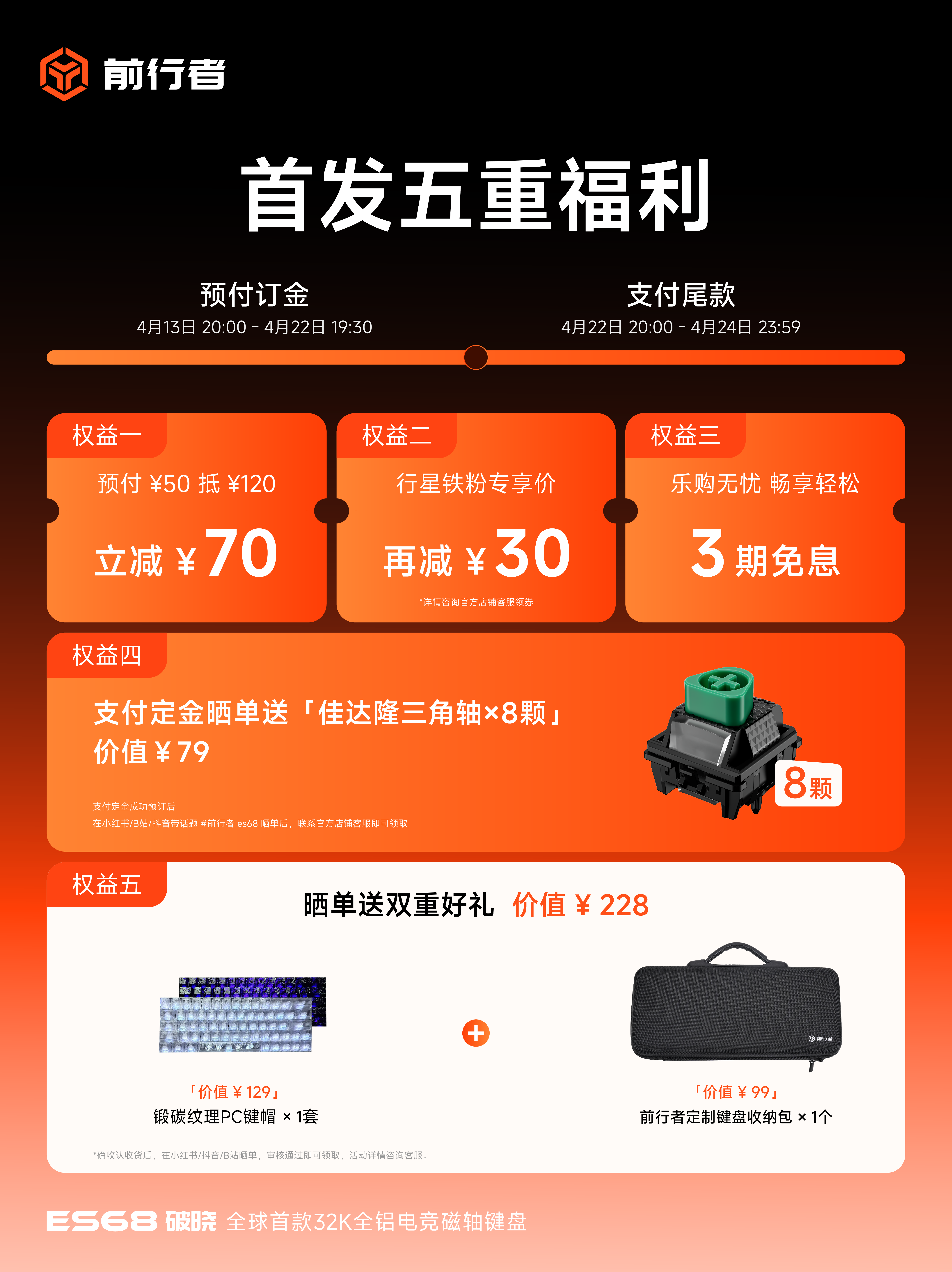 前行者ES68破晓现已开启预售,预售价699元起,首发期间设置多重配套福利,包括:铁粉专享优惠、3期免息,以及晒单可领取轴体、键帽及收纳包等周边礼品。